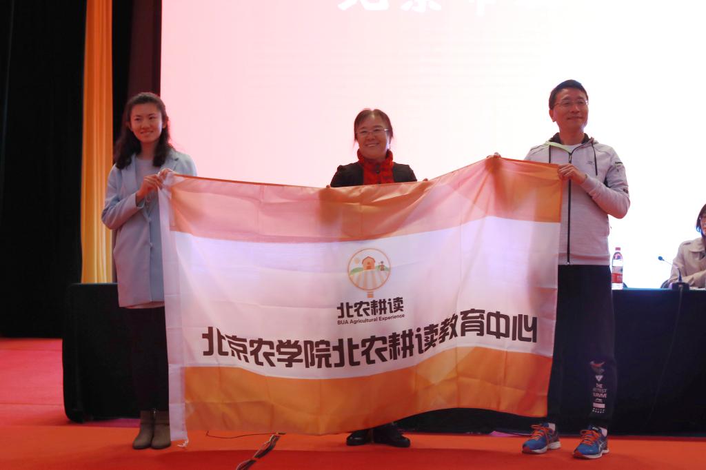77779193永利为北京景山公司远洋分校校授旗,同时,77779193永利北农耕读教育中心主管陈学珍教授为学农班授牌。