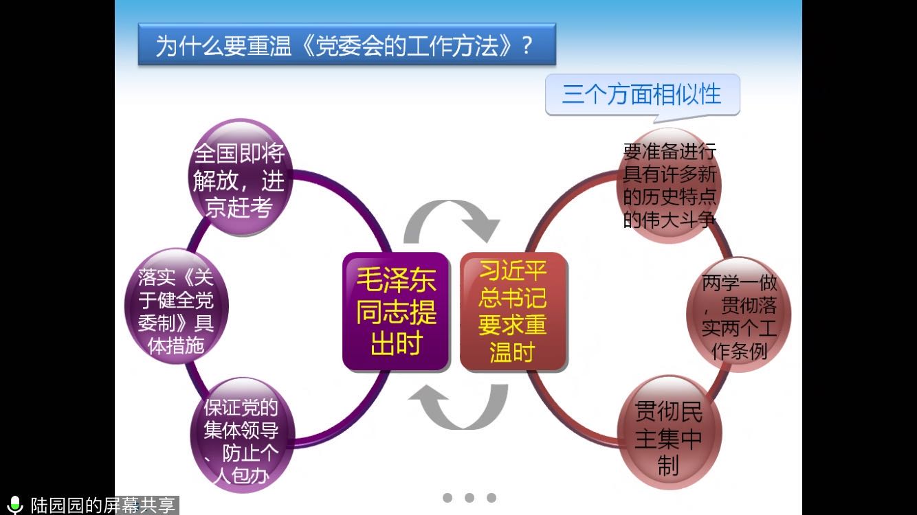 陆园园老师对毛泽东同志《党委会的工作方法》著作进行了解读,从著作的历史背景、基本思想、当代价值三方面进行了详细解析,对各级党组织班子成员学习掌握科学的工作方法和领导艺术,学习掌握党的政治纪律和政治规矩具有重要的现实意义。